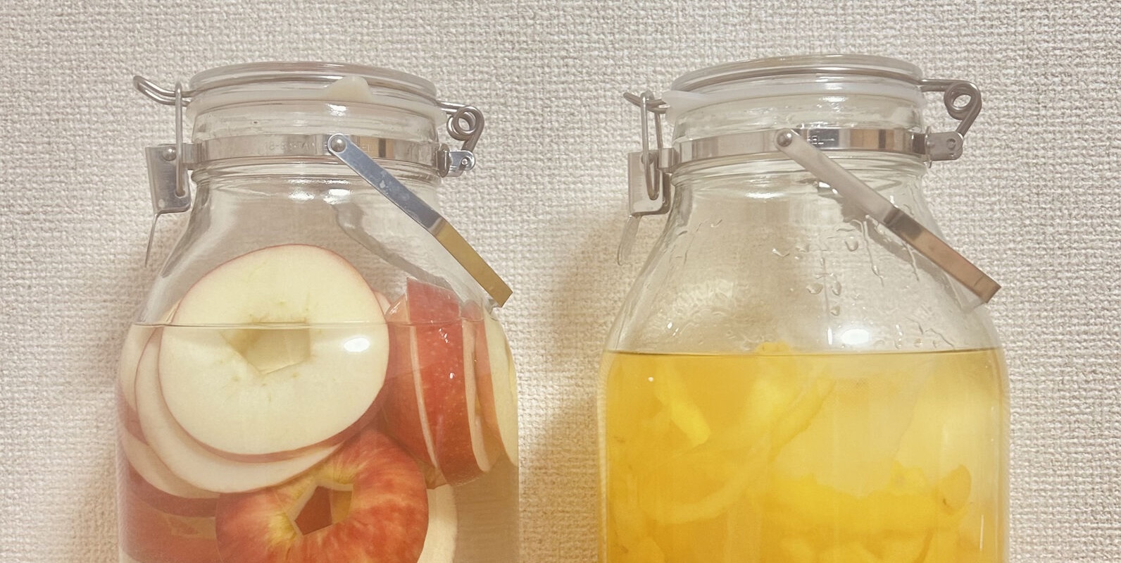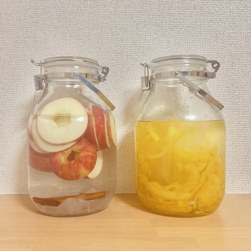写真左が、今回仕込んだアップルシナモン酒。右は、先日仕込んだゆず酒。