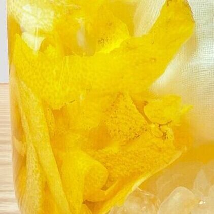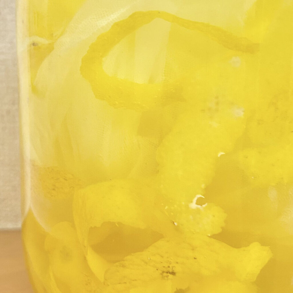 2週間が経ち、ゆずのフラベド=黄色い外果皮 の明るいイエローがお酒に抽出されています。