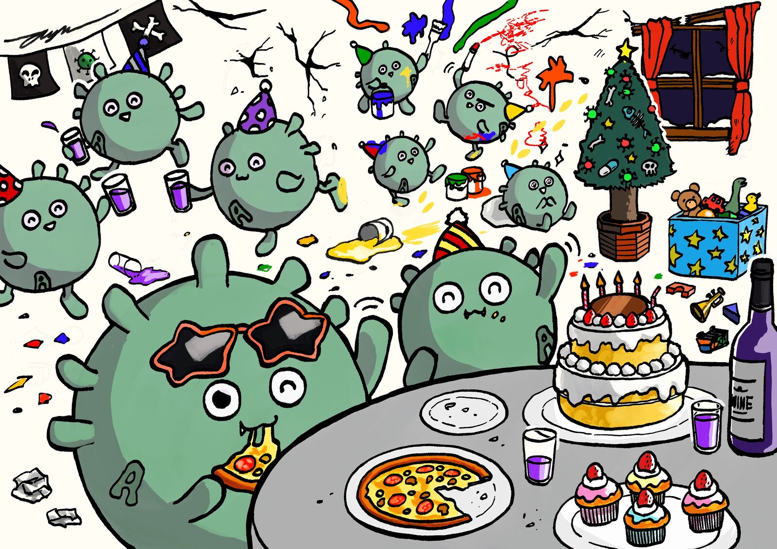 インフルエンザたちのクリスマスパーティー、イラストをかいてみました。