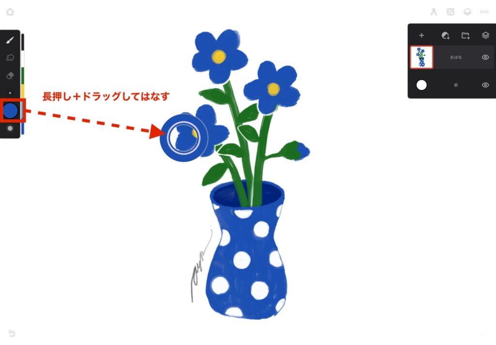 そのまま移動して、色を吸い取りたいところで離すと、その色を筆にとれます。