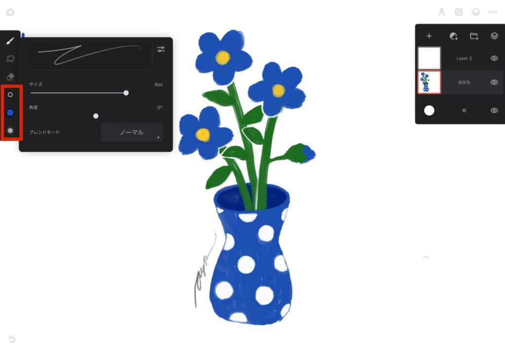 • サイズ・色・不透明度の調整アイコンを長押し+上下にドラッグでブラシ出力調整