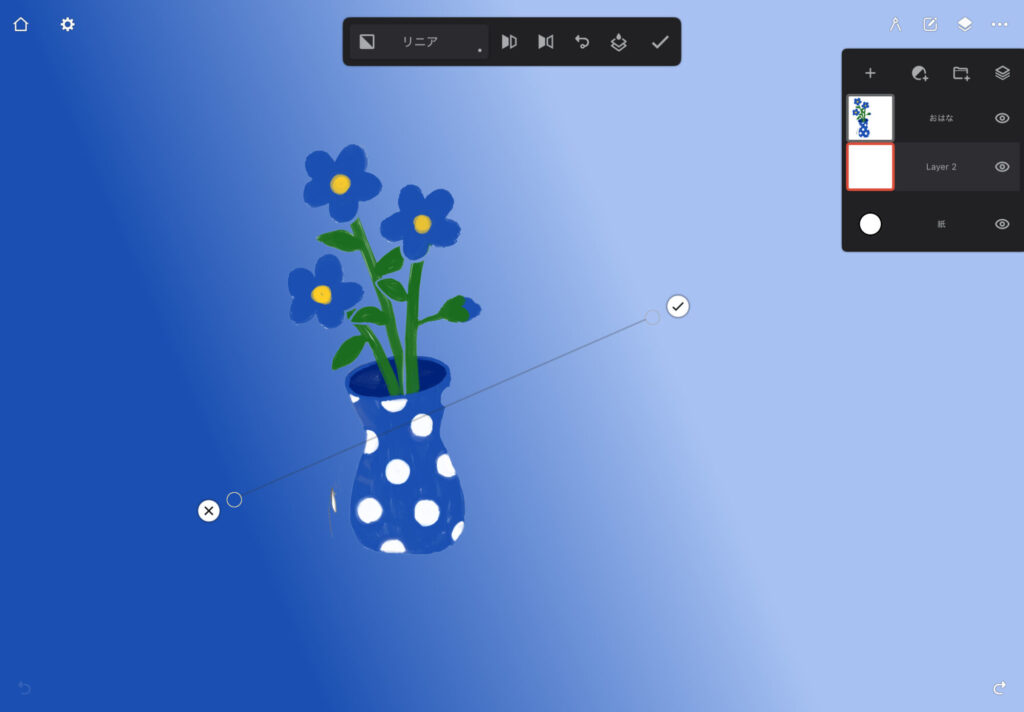 線をタップすると、上記のように線が選択された状態になり、両端にハンドルが出ます。