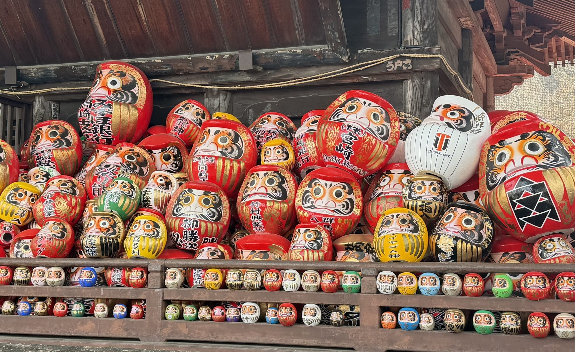 達磨寺のお堂の両サイドには、たくさんのだるまさんが並んでいます。