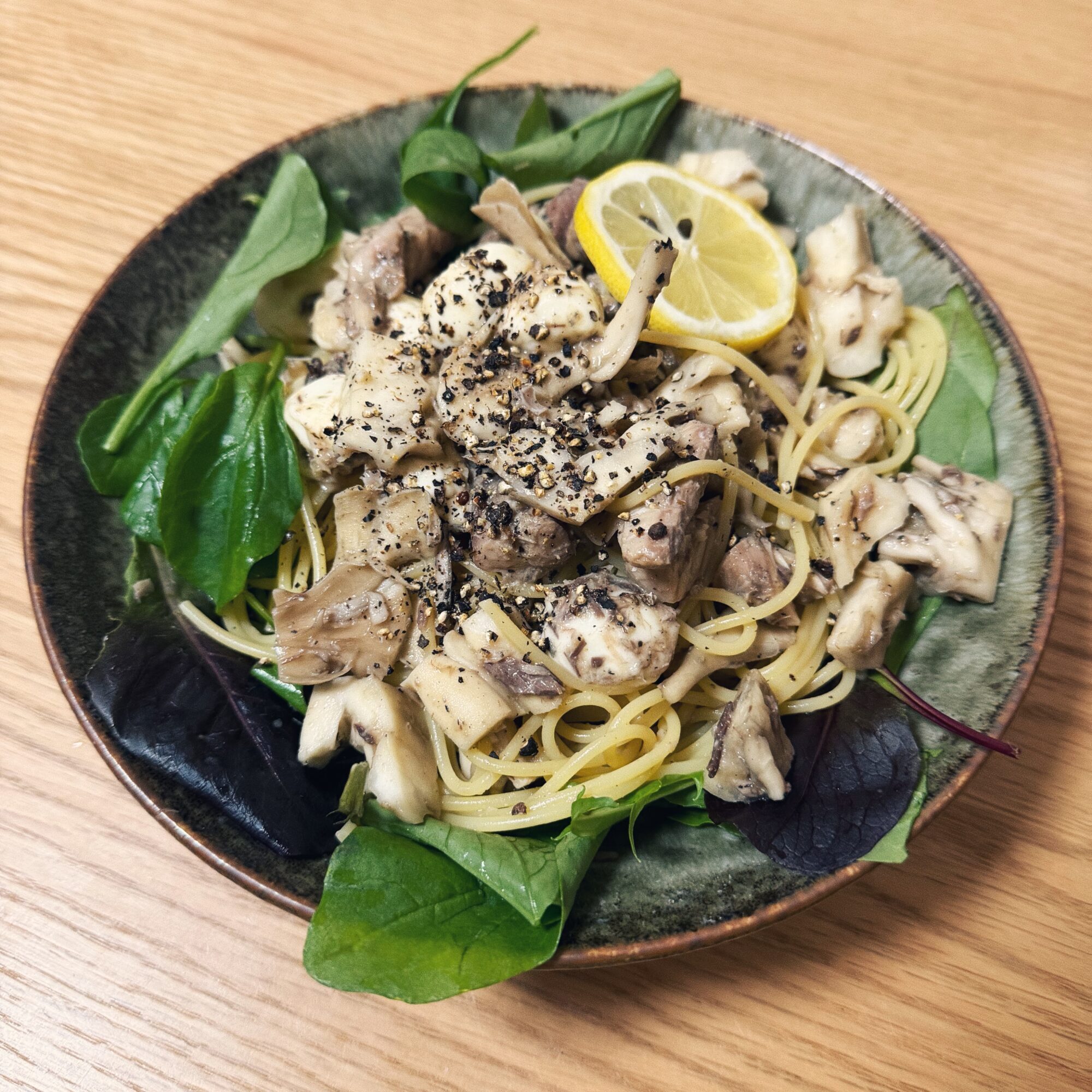 サバ缶と舞茸のレモン醤油パスタ